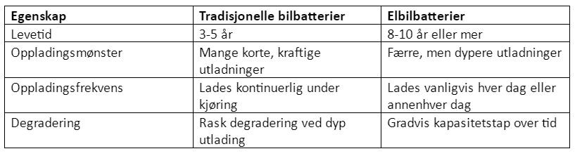 - Tradisjonelle bilbatterier: Rask degradering ved dyp utlading