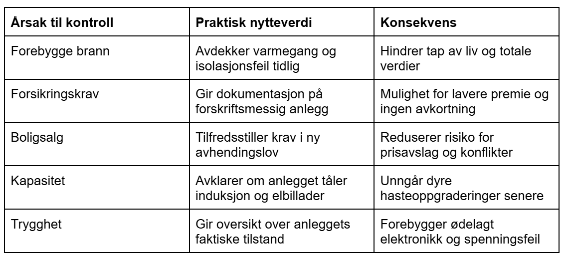 - En annen viktig årsak er de økonomiske fordelene knyttet til boligforsikringen din, ettersom mange forsikringsselskaper gir betydelige rabatter på premien dersom du kan dokumentere en godkjent el-kontroll.